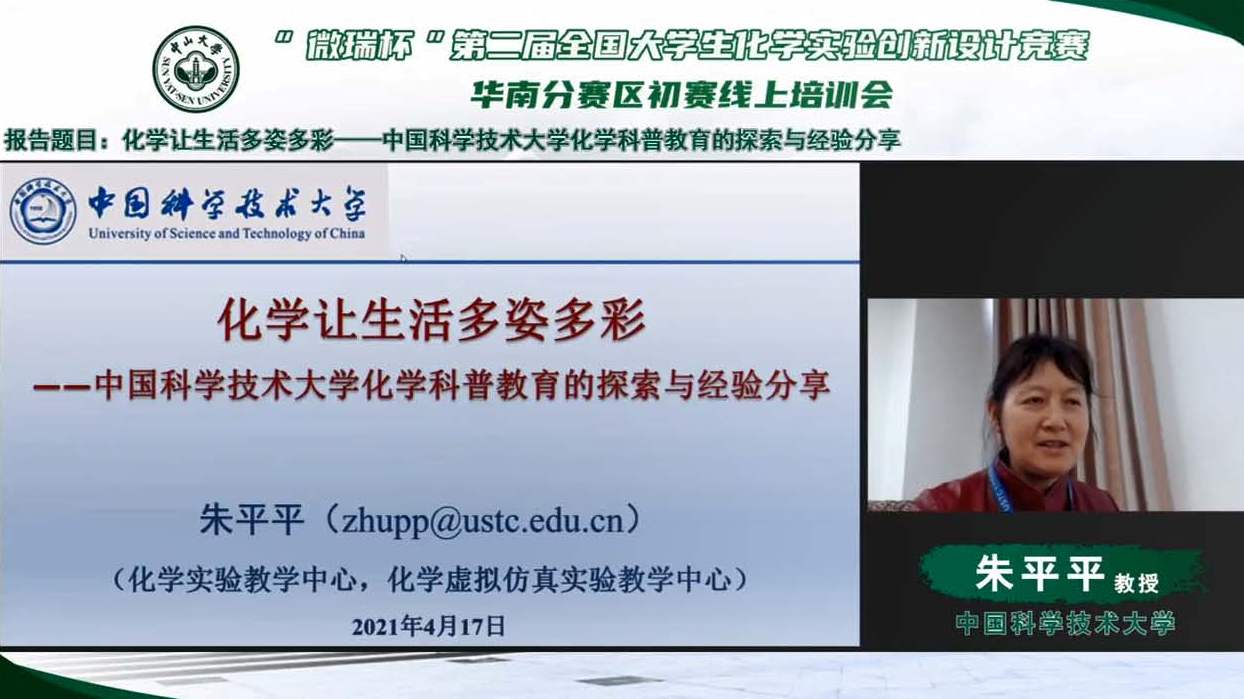 中国科学技术大学朱平平教授的报告题目为“化学让生活多姿多彩——中国科学技术大学化学科普教育的探索与经验分享”。朱平平教授首先介绍了中国科学技术大学开展的化学科普系列教育活动,特色鲜明,成效显著。然后介绍了科普实验竞赛的具体实施方案,对第一届竞赛中的优秀科普作品进行了点评分析,为高校准备科普竞赛作品提供了很多有益的建议。