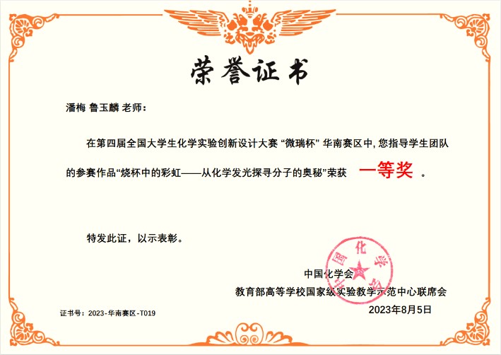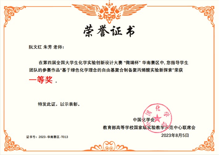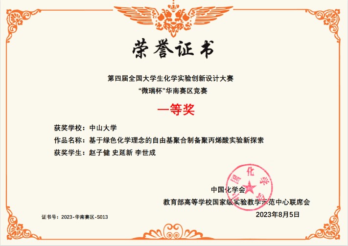 2023年8月20-23日, “微瑞杯”第四届全国大学生化学实验创新设计大赛总决赛在浙江大学举行,永利阮文红、朱芳两位教授共同指导本院2021级本科生赵子健、史延新、李世成参赛并荣获总决赛特等奖,获奖作品为“基于绿色化学理念的自由基聚合制备聚丙烯酸实验新探索”。