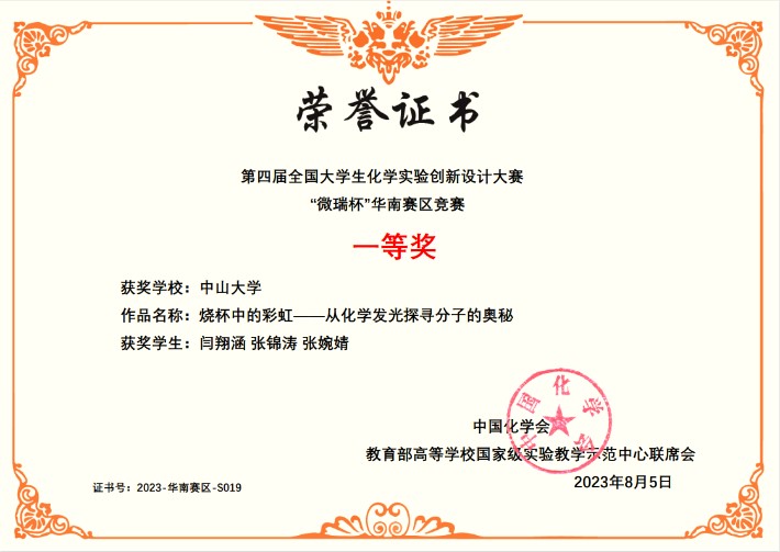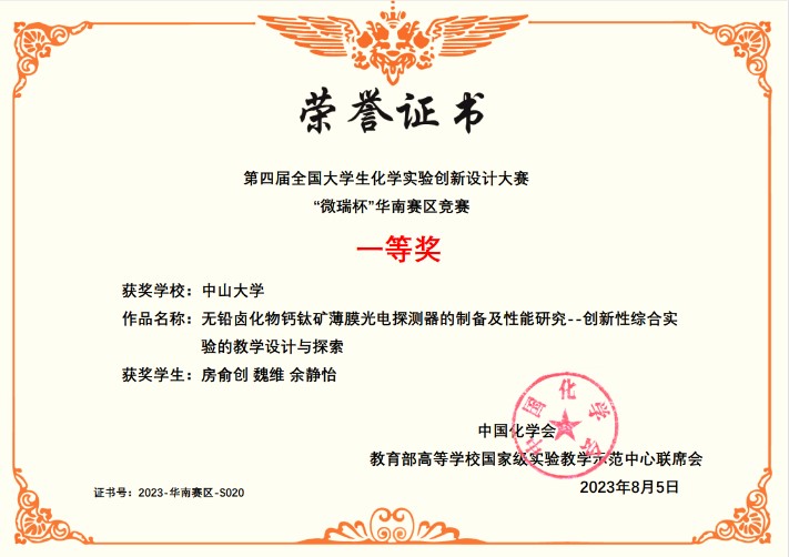 在华南赛区竞赛中,永利选送的三个作品均获得一等奖,分别为:改进实验作品《基于绿色化学理念的自由基聚合制备聚丙烯酸实验新探索》(指导教师:阮文红、朱芳;队员:赵子健、史延新、李世成)、新创实验作品《无铅卤化物钙钛矿薄膜光电探测器的制备及性能研究--创新性综合实验的教学设计与探索》(指导教师:王旭东、陈洪燕;队员:房俞创、魏维、余静怡)以及科普实验作品《烧杯中的彩虹——从化学发光探寻分子的奥秘》(指导教师:潘梅、鲁玉麟;队员:闫翔涵、张锦涛、张婉婧)。因赛制规定每校仅能推荐一项作品参加全国总决赛,根据赛事遴选规则,由改进实验作品代表永利参加总决赛。在总决赛中,该作品在全国90项参赛作品中脱颖而出,荣获全国总决赛特等奖。