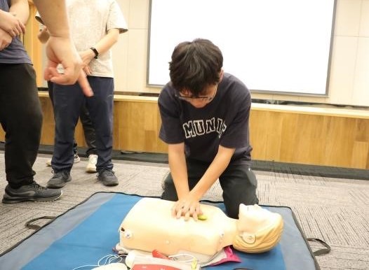 熊艳主任对外出血、热烫伤、化学烧伤等十种校园常见健康意外的急救措施进行了详细的介绍,重点强调了应急处置心肺复苏术的重要性和实际操作。最后,熊艳主任与助理现场演示了心肺复苏术的详细步骤以及自动体外心脏除颤仪(AED)的使用。