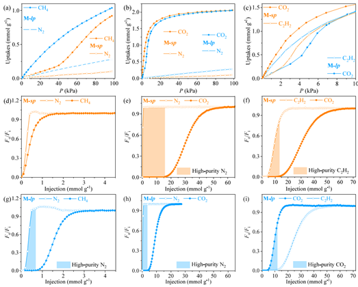 图4 M的气体吸附和分离行为。(a-c)M大孔相和小孔相的单组分(a)CH4/N2、(b)CO2/N2和(c)CO2/C2H2吸附等温线;(d-i)M大孔相和小孔相的(d,g)20:80 CH4/N2、(e,h)1:99 CO2/N2和(f,i)1:1:98 CO2/C2H2/Ar混合物穿透曲线。