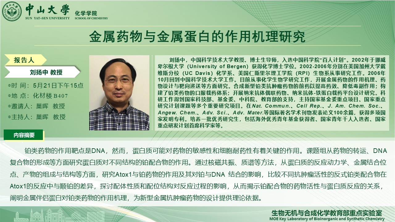 导航痕迹 首页 科学研究 学术报告 2025年5月21日讲座论坛:金属药物与金属蛋白的作用机理研究 2025年5月21日讲座论坛:金属药物与金属蛋白的作用机理研究 发布日期:2025-05-19